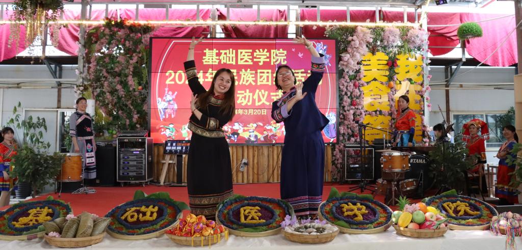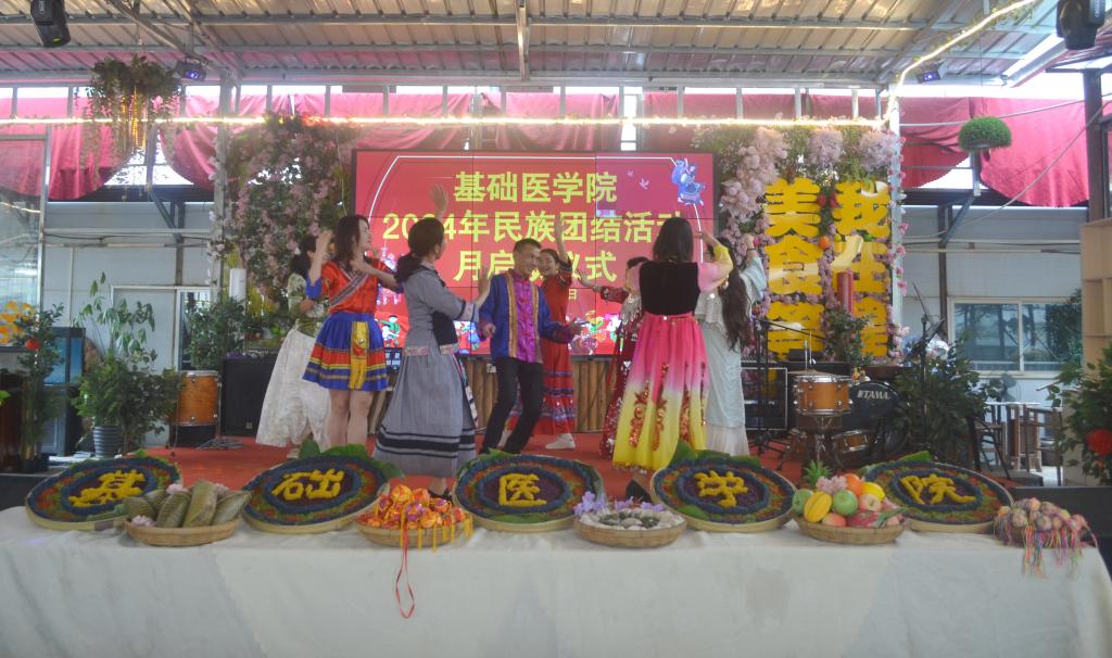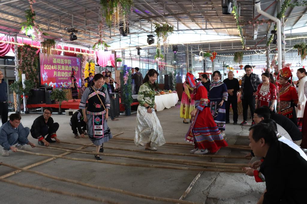 之后,欢快的音乐响起,教职工们身着各具特色的民族服饰,跳起了别具民族特色的“竹竿舞”,“竹竿舞”展现出优美的舞姿和默契的配合,仿佛在述说着一部关于团结、合作和友爱的故事。