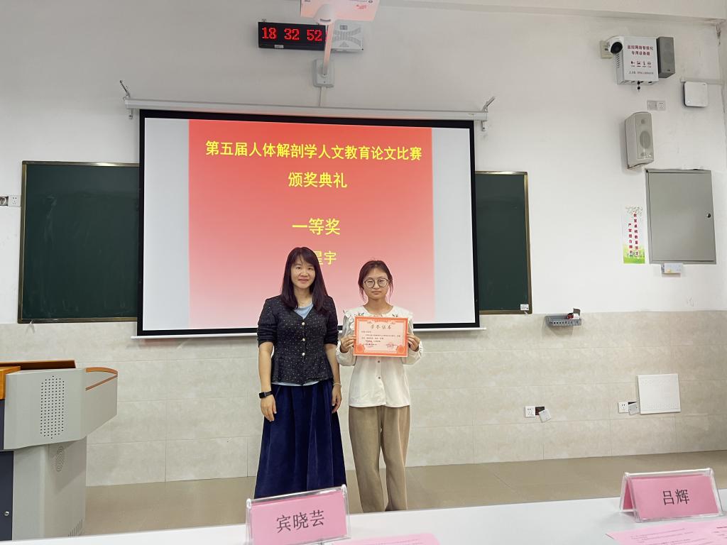 公司党委书记宾晓芸教授宣读第五届人体解剖学人文教育论文获奖名单,由出席颁奖典礼的老师分别为刘星宇等18位获奖同学颁奖。