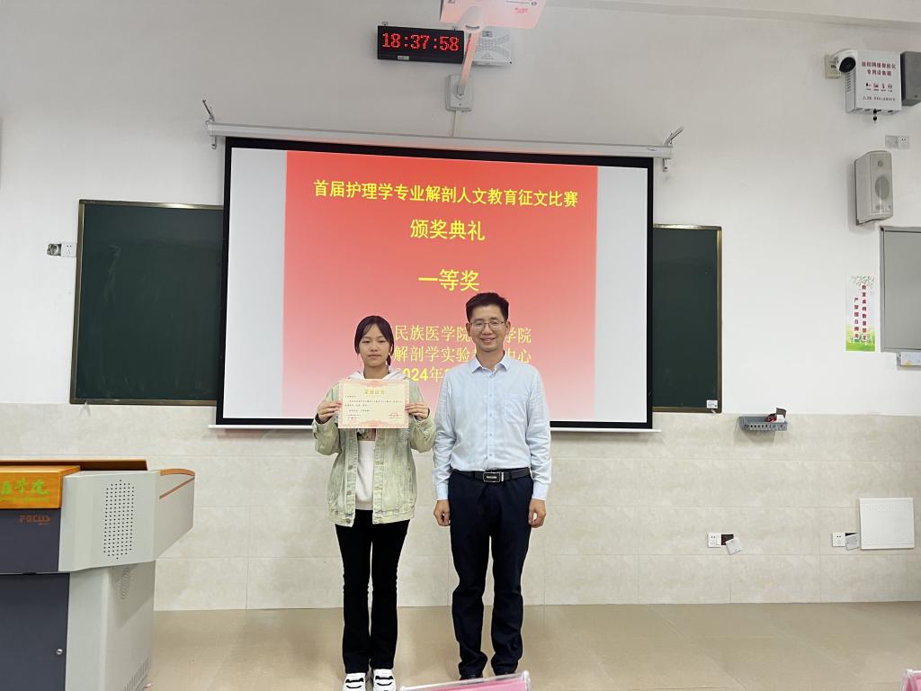 紧接着进行的是首届护理学专业解剖人文教育征文比赛颁奖典礼。吕辉副教授宣读首届护理学专业解剖人文教育征文比赛获奖名单,由出席颁奖典礼的老师分别为方雨珊等20位获奖同学颁奖。吕辉副教授谆谆教导,从自身求学经历出发,以现有学习条件之优为引,鼓励同学们努力学习,致力于为医学事业作出贡献。