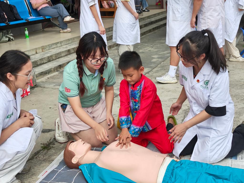与此同时,团队同步开展急救技能培训、“健康润童心” 课堂。在急救技能培训中,实践团成员手把手教学,村民们积极参与实操练习,快速掌握了基础的急救知识;“健康润童心” 课堂上,团队引导儿童体验拍手操、负重体验等健康运动,在轻松愉快的氛围中培养孩子们的健康意识,进一步强化了全体村民的健康理念。