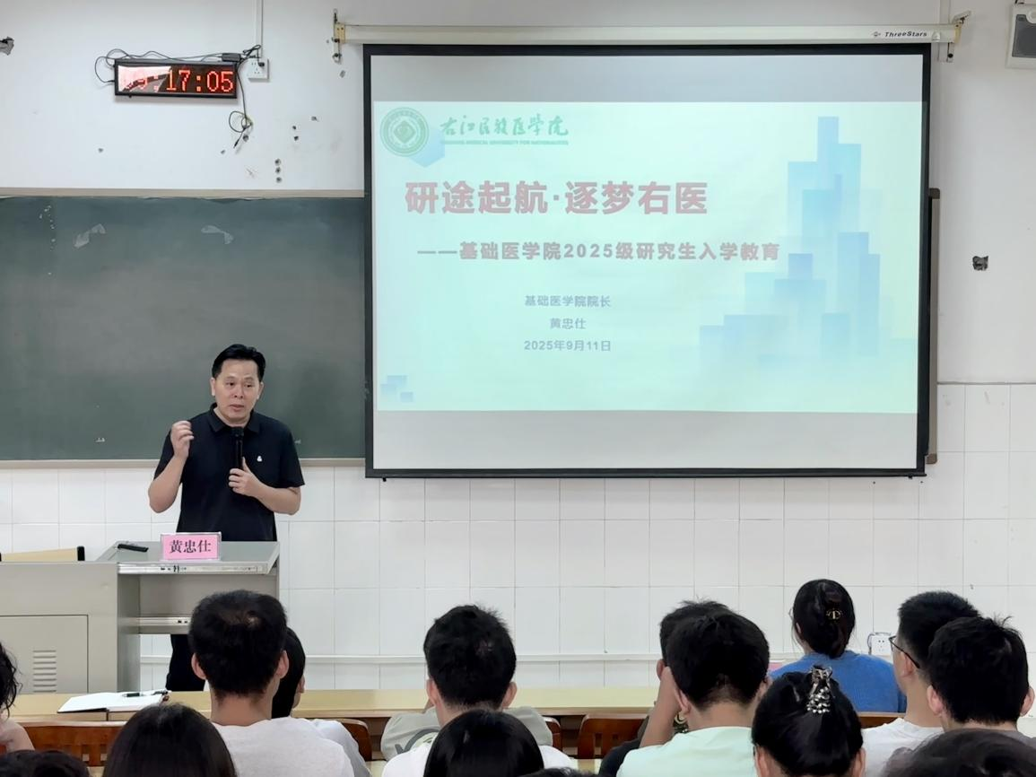 williamhill经理黄忠仕以“沿途起航,逐梦右医”主题,向同学们详细介绍了williamhill官网的发展历程、办学特色与学科优势。他特别强调:研究生要明确“知识学习者、学术研究者、自我管理者、团队协作者”的角色定位,着力提升文献查阅归纳、实验设计、组织实施及科研表达等能力,并警示同学们要坚守科研诚信底线、杜绝学术不端行为。