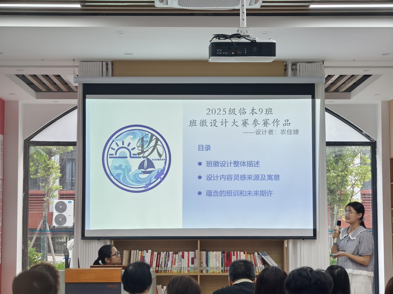 在本次比赛中,各班班徽、班训设计者依次登台介绍班徽、班训的设计思路,从最初的灵感构思、元素提炼,到设计草图的修改过程、色彩方案的精心搭配,他们的讲解不仅展现了设计的巧思,更传递出各班的精神风貌与文化内涵。设计者对班徽、班训设计过程的细致讲述,让评委老师和观众们对各班的班徽、班训设计有了更深入的理解。