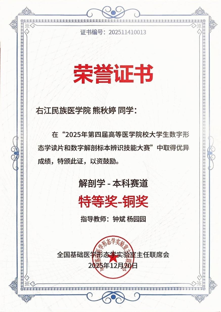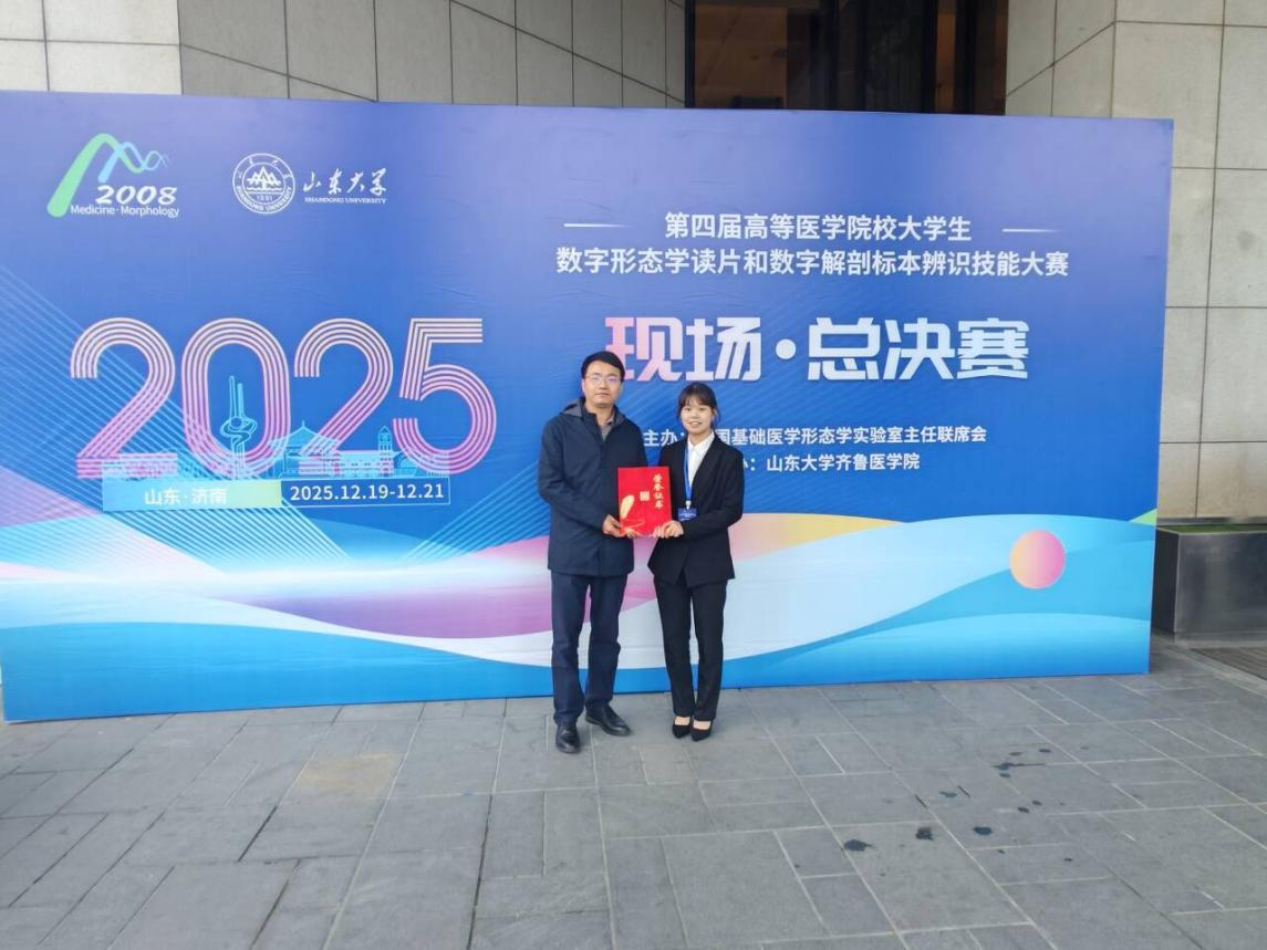 近日,由全国基础医学形态学实验室主任联席会与山东数字人科技股份有限公司联合主办的“第四届高等医公司校老员工数字形态学读片和数字解剖标本辨识技能大赛”圆满落幕。公司2022级临床医学专业熊秋婷在12月20日于山东济南举行的现场总决赛中荣获特等奖之铜奖。