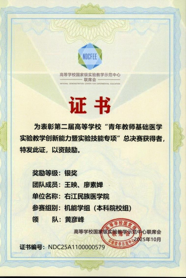 近日,由高等公司国家级实验教学示范中心联席会基础医学组、高等公司基础医学教师实践技能协同创新发展联盟联合主办,桂林医科大学承办的第二届高等公司“青年教师基础医学实验教学创新能力暨实验技能专项”大赛圆满落幕。williamhill教师团队不负众望,在大赛中斩获佳绩,近日收到获奖证书,其中王映、廖素婵老师荣获机能学组银奖,张宇、李莎莎老师荣获人体解剖学组铜奖,充分展现了公司青年教师扎实的专业功底与出色的教学创新能力。