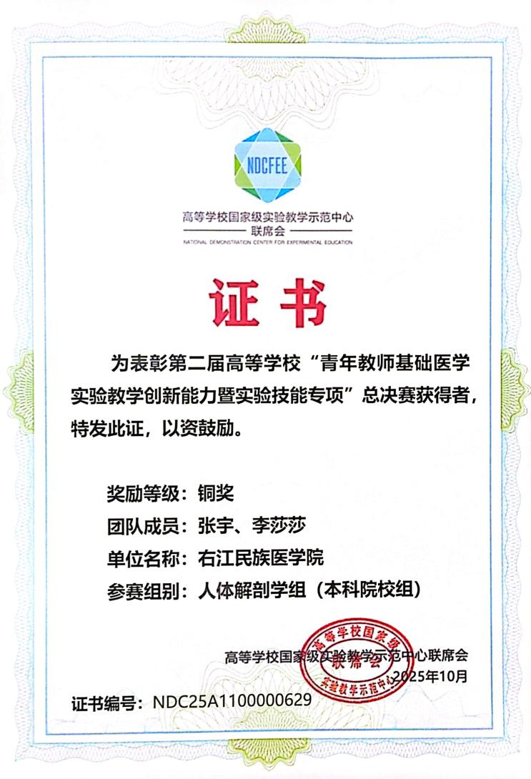 图2:张宇、李莎莎老师获人体解剖学组三等奖证书