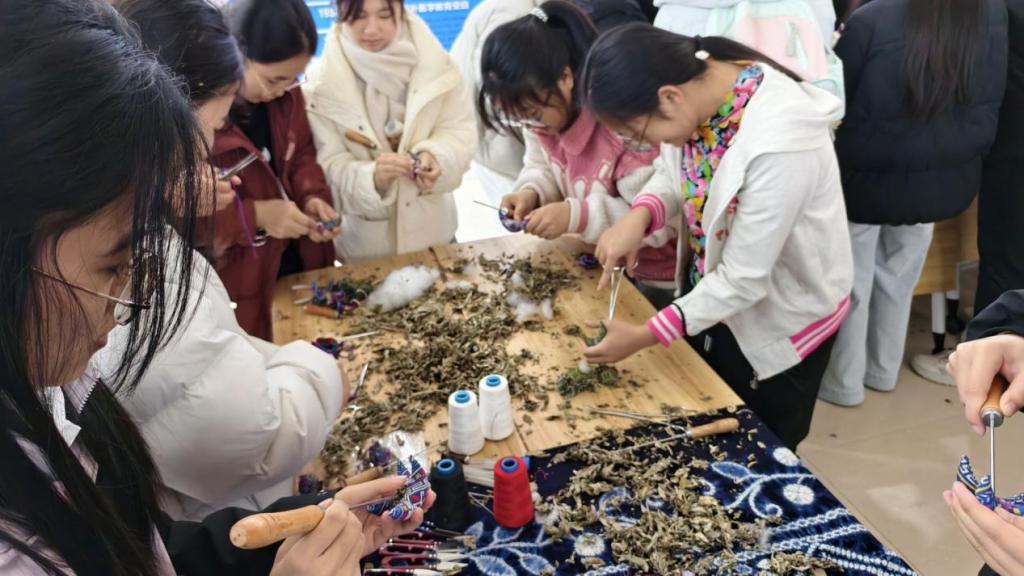 非遗体验区同样气氛热烈。在扇面书法创作区,师生们提笔挥毫,将“马到成功”“宏图大展”等美好祝愿题写于扇面,墨香流淌,雅趣盎然;在扎染与麽乜制作区,参与者们在指导下亲手体验布料捆扎、浸染等非遗技艺,制作出各具特色的扎染织物与寓意吉祥的麽乜饰物。扎染作为国家级非物质文化遗产,以其自然的色彩变幻展现东方美学韵味;而麽乜制作则融合壮乡民俗与祈福文化,让师生在动手实践中真切感受到传统手工艺的温度与情感。