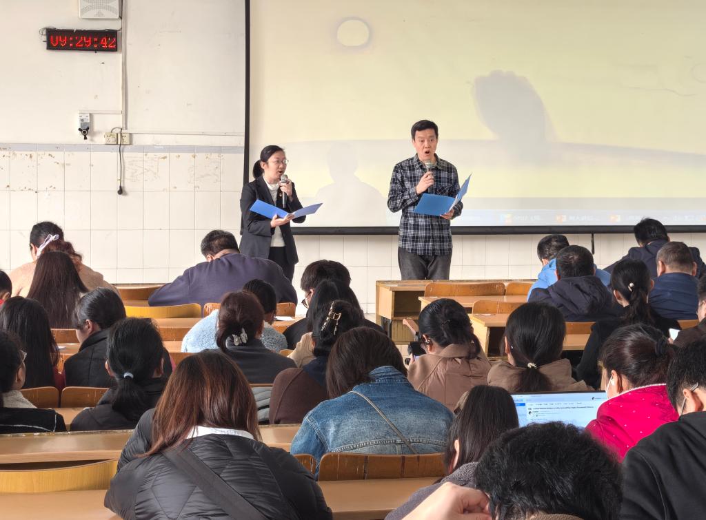 紧接着,教师代表们深情朗诵《点一盏灯,照一路人》。朗朗书声中,既饱含着对师者匠心的崇敬,也诉说着教育薪火代代相传的初心使命,生动展现了新时代高校教育工作者立德树人、培根铸魂的责任担当,将活动氛围推向高潮。