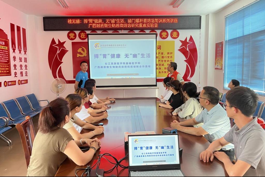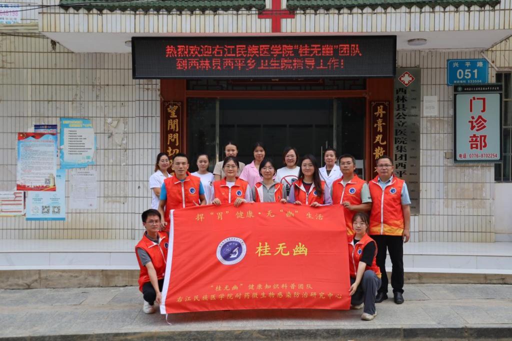7月25日下午,团队到达西林县西平乡卫生院,进行了幽门螺杆菌防治系列的知识讲座,并播放了幽门螺杆菌防治知识的科普视频,对基层医生、护士等进行规范化诊疗培训,帮助他们认识到幽门螺杆菌感染及耐药的严重性。通过深入讲解一系列的防治方法,提高了基层卫生院规范化诊疗的水平和村民的生活质量,发挥了“闭环式”服务模式和团队各平台的作用。