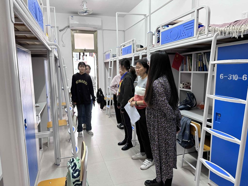在检查过程中,整体宿舍内务较好,宿舍干净整洁。但有个别宿舍桌面物品摆放比较凌乱、垃圾不能及时清理、床上被子不叠、床帘乱挂乱拉。辅导员要求同学们做好宿舍内务卫生,定期消毒、多开窗通风,以保持宿舍空气流通,杜绝使用违规电器,确保生命财产安全;对问题特别突出的宿舍,老师们耐心指导员工进行宿舍内务整理,与同学们亲切交流,关注同学们目前存在的困难和问题,引导同学们正确处理学习、生活、人际的关系。