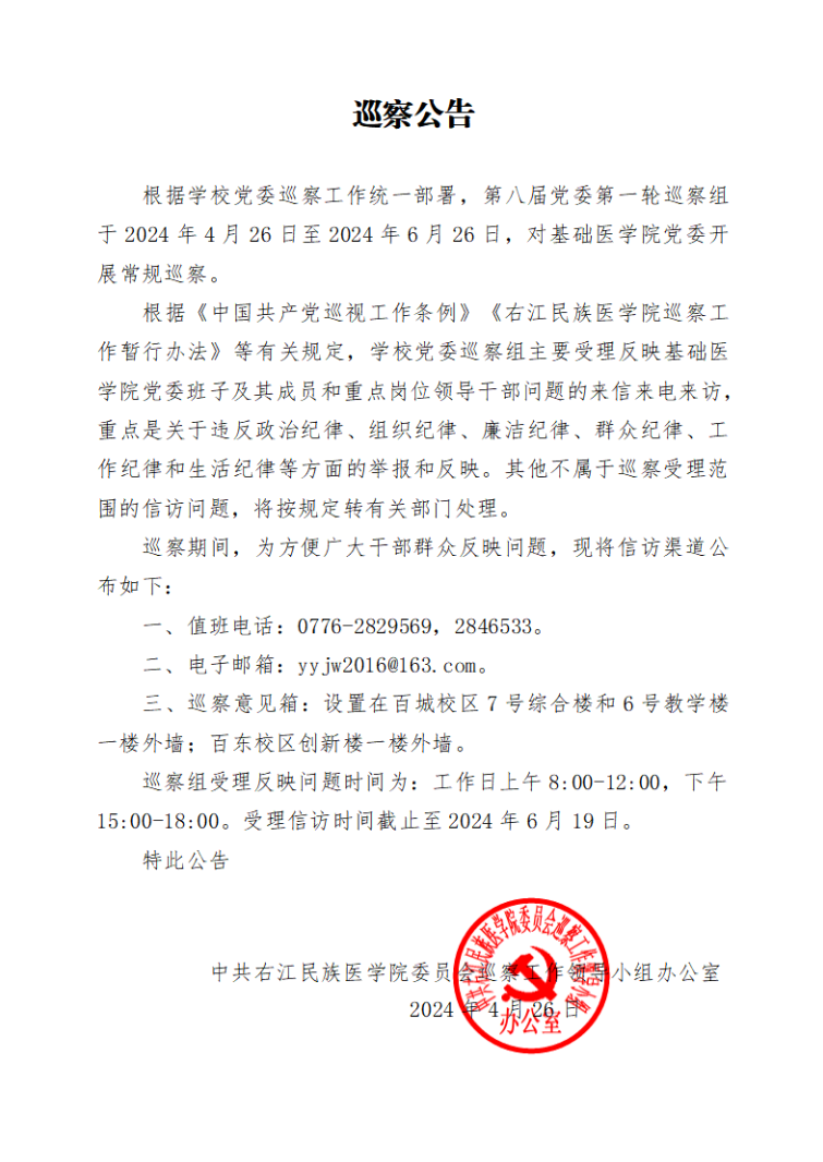 第八届党委第一轮校内巡察公告